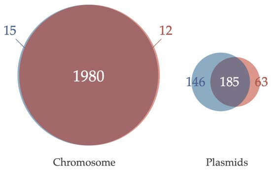 Common and unique genes in the two Acaryochloris strains. Euler diagram showing the common genes between A. marina MBIC10699 (red) and A. marina MBIC11017 (blue) for each chromosome and plasmids, respectively. Genes annotated by KEGG with the same ID were considered common. The numbers indicate the number of genes in the fraction.