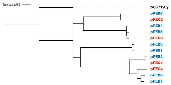 It has been reported that plasmids contain mobilization factors such as oriT and relaxases as factors involved in their mobility from cell to other cells via conjugation [25,26]. Among these factors, it has been proposed that plasmids can be classified based on the sequences of relaxases, which are essential for mobility. The relaxase gene was found one by one on all four pREC plasmids in MB10699, and on all pREB plasmids except pREB9 in MB11017. Since the relaxase gene is a unique factor for each plasmid, the correspondence of the plasmids between the two Acaryochloris strains was analyzed based on the homology of this relaxase gene, mobF (Figure 6). Phylogenetic analysis using the amino acid sequences of MobF revealed that they were classified into two major clades, each of which further branched into two subgroups. The phylogenetic relationship of relaxases suggested that pREC1 is of the same origin as pREB2, pREC2 as pREB6, pREC3 as pREB4,5, and pREC4 as pREB7,8, respectively. In fact, dot plot analysis and ANI comparisons indicated high similarities in the pairs of pREC1/pREB2 and pREC2/pREB6; thus, this plasmid classification based on phylogenetic analysis of relaxases is considered reliable. From these results, the pREC1/pREB2 pair and the pREC2/pREB6 pair are likely derived from common ancestral plasmids, respectively, and similarly the pair of pREC3/pREB4(5) and pREC4/pREB7(8) are also assumed to be derived from the same origins. There is no MB10699 plasmid in the clade corresponding to pREB1 and pREB3, suggesting that these plasmids were either acquired after the divergence of the two species or lost at MB10699 after the divergence. This suggests that HGT of PBP-related genes in pREB3 possibly occurred in plasmid units.