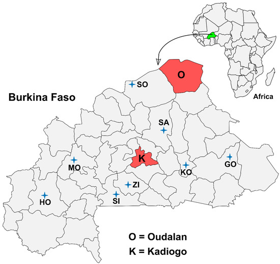 This cross-sectional study was conducted in the period between August and September 2013, in two selected regions in Burkina Faso, namely Oudalan (Sahel region) and Ouagadougou (Central region) (Appendix A Figure A1).