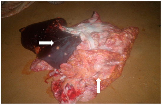 Gross appearance of granulomatous bTB suggestive lesions in the liver and lungs of a slaughtered cattle in Burkina Faso (indicated by white arrows). bTB = bovine tuberculosis.