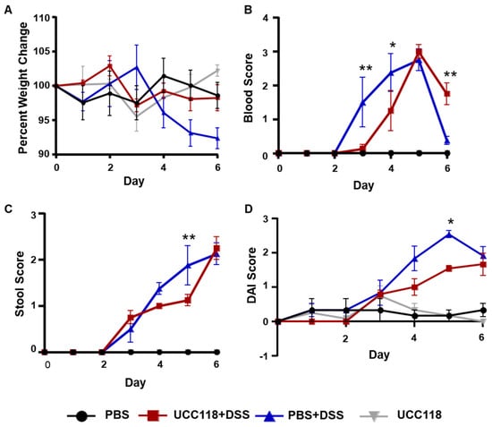 Pre-treatment with UCC118TM reduces severity of disease in a DSS-induced colitis model. C57BL/6JOlaHsd mice were pre-treated with 100 μL UCC118™ (109 CFU/mouse) or sterile PBS by oral gavage daily. On day 7, mice were treated with 2.5% dextran sulphate–sodium via drinking water ad libitum for 6 days. Mice were weighed daily (A) and stool was checked for occult blood (B) and diarrhoea (C). Disease activity index (DAI, D) was plotted as an average of weight score, blood score and stool score on a scale of 0–4. Representative results of two independent experiments. Statistical analysis performed by two-way ANOVA. Stars indicate statistical significance in comparisons between PBS + DSS and UCC118 + DSS groups. ** p < 0.01, * p < 0.05. n = 4 mice per group.