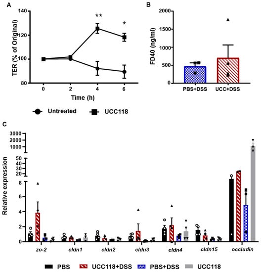 A human Caco-2 adenocarcinoma cell line was used to model intestinal epithelial cells. Caco-2 cells were maintained at 37 °C plus 5% CO2 and 95% relative humidity in complete Dulbecco’s Modified Eagle Medium (DMEM; Gibco) supplemented with 10% foetal calf serum (FCS; Gibco) and 1% penicillin–streptomycin (PS; Sigma, St Louis, MO, USA). For use in experiments, Caco-2 cells were seeded onto 12-well transwell plates (3 µM pore-size polycarbonate membranes, Costar, Corning, New York, NY, USA) at a density of 6 × 104 cells/cm2 and allowed to differentiate for 21 days or until transepithelial electrical resistance (TER; Ω/cm2) >300 Ω/cm2. TER was measured across Caco-2 monolayers as an estimate of tight junctional integrity using an epithelial volt-ohmmeter (EVOM) and chopstick attachment (Millipore, Burlington, MA, USA). On the day of the assay, monolayers were either cultured with UCC118™ at 1 × 108 CFU/mL alone or left untreated. TER was measured prior to commencement of treatments, following pretreatment, and then at 2 h intervals thereafter. Change in TER is represented as a percentage of original TER.