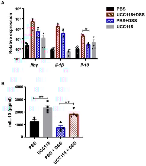 We hypothesised that the protective effect of UCC118™ against intestinal inflammation might be mediated by the mucosal immune response. Colonic tissue of the mice from control and DSS treatment groups was analysed for the expression of key cytokines. Interferon-γ and interleukin-1β expression were similarly expressed in the PBS +DSS and UCC118 + DSS groups; however, interleukin-10 expression was significantly upregulated by UCC118™ compared to PBS (Figure 3A). A similar increase in IL-10 gene expression was also observed at baseline after 7 days of UCC118™ treatment, though IL-10 levels measured by ELISA remained unchanged (Supplementary Figure S2). IL-10 protein levels in the DSS-treated cohort were determined by ELISA. ELISA showed a significant upregulation of IL-10 in the UCC118™-alone mice compared to PBS control mice (Figure 3B). Similarly, UCC118 + DSS mice showed higher levels of IL-10 in colonic tissue compared to PBS + DSS mice (Figure 3). These results suggest that the protective effect of UCC118™ against colitis might derive from the upregulation of the anti-inflammatory cytokine IL-10.