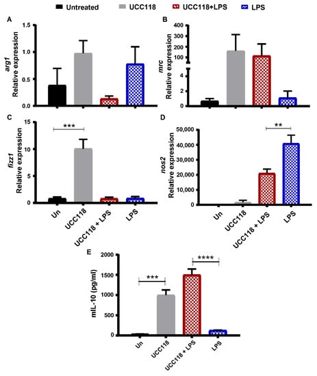 The increased level of IL-10 in the UCC118™-treated colitic mice suggests that the probiotic might have an anti-inflammatory effect in vivo. These observations are in line with a study in a mouse model of rheumatoid arthritis where treatment with UCC118™ reduced inflammation and upregulated IL-10 production [16]. In a study of MLN mononuclear cells from colitis patients by O’Mahony et al., incubation with UCC118™ resulted in a similar increase in IL-10 secretion [17]. We postulated that this anti-inflammatory action of UCC118™ might be the result of the effect of the probiotic on immune cells in the colonic lamina propria, specifically macrophages. To test this hypothesis in vitro, we used murine bone marrow-derived macrophages (BMDMs) as a model. Naïve or LPS-treated BMDMs were incubated with UCC118™. Treatment of naïve BMDMs with UCC118™ significantly upregulated the expression of M2 macrophage markers arg1, mrc and fizz1 (Figure 4A–C) and was associated with an increase in IL-10 secretion (Figure 4E). In LPS-stimulated BMDMs, UCC118™ treatment upregulated the expression of M2 marker gene mrc, downregulated the M1 macrophage marker gene nos2 (Figure 4A–D) and was again associated with significantly higher levels of IL-10 secretion compared to the LPS-only control (Figure 4E). These results suggest that UCC118™ promotes an M2-like phenotype in BMDMs to increase the production of IL-10.