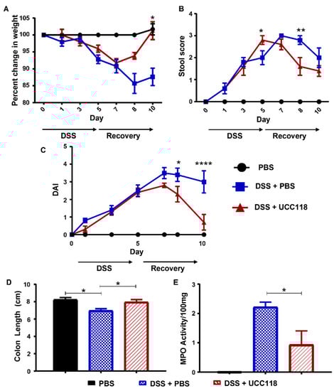 3.5. Lactobacillus salivarius UCC118™ Promotes Recovery from DSS-Induced Colitis