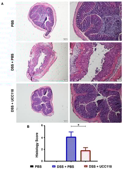 Given the anti-inflammatory effect of UCC118™ in vitro as well as in the pre-treatment model of colitis, we next sought to determine whether the UCC118™ strain could offer any therapeutic effect in already established colitis. A DSS-recovery model was employed to determine whether administration of UCC118™ during recovery from DSS-induced colitis could enhance recovery and restore the intestinal epithelium. As expected, all groups of mice experienced disease symptoms at a relatively uniform rate during induction of colitis with DSS (Figure 5A). Following the removal of DSS and return to normal drinking water, mice received UCC118™ or PBS by oral gavage. During this recovery period, mice administered UCC118™ exhibited accelerated recovery as evidenced by increased appetite, increased weight gain (Figure 5A), reduced diarrhoea (Figure 5B) and a reduction in the overall disease activity (Figure 5C) compared to PBS-treated mice. Faecal blood scores were not included in the calculation of DAI, as occult blood proved undetectable across both treatment groups once DSS was removed. Following termination of the trial, colon lengths were measured and found to be significantly increased in mice which received UCC118™ during the recovery period compared to those recovering from DSS with PBS administration (Figure 5D). Interestingly, there was no significant difference in colon length between mice receiving UCC118™ strain and the water control mice. MPO activity appeared to be lower in UCC118™-treated mice compared to PBS-treated mice, which was further indicative of reduced inflammation (Figure 5E). Histological analysis showed that, as expected, water control mice displayed no inflammation. DSS + PBS mice had significantly more inflammation in colonic tissue compared to DSS + UCC118 mice, as indicated by a cumulative histology score generated from crypt damage and inflammatory infiltrate scores (Figure 6A,B).