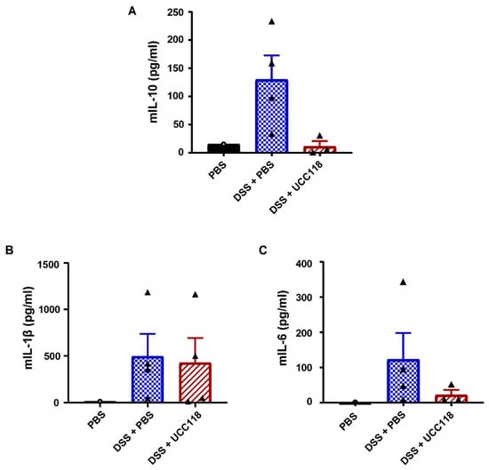 UCC118™ was seen to be highly effective as a therapeutic to promote recovery from DSS-induced colitis. We hypothesised that UCC118™-induced IL-10 might be responsible for this effect. IL-10 levels as measured by ELISA showed an opposite trend compared to expectations, with lower levels of IL-10 in colonic tissues of DSS mice treated with UCC118™ compared to DSS + PBS mice (Figure 7A). ELISA analysis showed that while levels of inflammatory cytokine IL-1β were significantly higher in colitis mice compared to healthy controls, no significant difference was seen between the UCC118™ and PBS-treated colitis mice (Figure 7B). UCC118™ treatment resulted in lower IL-6 levels in the colon compared to DSS + PBS mice, though the trend did not reach statistical significance (Figure 7C). These results suggest that the therapeutic benefit of UCC118™ in the DSS-colitis recovery model is independent of IL-10.