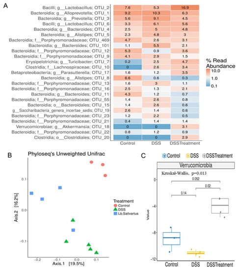 Our data suggest that UCC118™ promotes recovery from colitis in an IL-10 independent mechanism. We wanted to investigate if other mechanisms might be involved in this therapeutic effect. UCC118™ has previously been used as a probiotic in both rodent and animal models [10,18]. UCC118™ has been shown to reach the intestine and retain viability in the gastrointestinal tract. Studies of probiotic administration of UCC118™ in healthy mice have shown that the probiotic has a relatively subtle effect on the mouse microbiome, affecting a few genera in the Bacteroidetes and Firmicutes phyla. The bacteriocin produced by UCC118™ has been implicated in this effect [18]. Therefore, we assessed whether the administration of Lactobacillus salivarius UCC118™ to mice following induction of colitis could restore any changes to the microbiota as a result of inflammation. 16S rRNA sequencing of faecal samples was employed to investigate the differences in the composition of the microbiota between Lactobacillus salivarius UCC118™-treated or PBS control mice following recovery from DSS-colitis. After quality filtering and length trimming, an average of 134,490.7 (±24,288.52 SD) 16S rRNA high-quality sequences were generated per sample. These corresponded to three different groups: Control (N = 3), DSS-PBS (N = 5), DSS-Treatment (N = 4). The most abundant phyla found in these samples were Firmicutes, Bacteroides, Candidatus Saccharibacteria, Proteobacteria and Actinobacteria. The more abundant families detected were Porphyromoandaceae, Lactobacillaceae, Prevotelalceae, Bacteroidaceae, Lachnospiraceae, Rikenellaceae, Ruminococcaceae and Erysipelotrichaceae. At genus level, the most abundant were Lactobacillus, as well as Alloprevotella, Bacteroides, Alistipes, Prevotella, Parasutterella, Turicibacter, Saccharibacteria, Barnesiella and Akkermansia. Each group showed quite varied assignments, indicating a distinct microbial profile for each. This distinction in bacterial composition was evident at the 25 most abundant operational taxonomic units (OTUs) shown in Figure 8A, indicating each OTU with their respective genus and phylum name (Figure 8A). The alpha diversity did not differ significantly across groups (p > 0.05, 2-way ANOVA). However, significant (p value = 0.001) differences in beta-diversity were evident between all groups, with a clear phylogenetic separation between all groups as represented by Principal Coordinates Analysis (PcoA) following the clustering of all reads at 97% similarity (Figure 8B). Akkermansia emerged as being the phylum with the most striking differences between groups, being significantly more abundant in the DSS-Treatment group (Figure 8C). As was expected due to the association of DSS-models with causing dysbiosis, the most striking differences are evident between control samples compared with the two DSS-recovery groups. In the control group, we see higher Alistipes, Bacteroides, Porphyromonadaceae and Saccharibacteria genera incertae sedis and a lower proportion of Clostridia, Lachnospiraceae, Erysipelotrichia, Turicibacter and Bacteroides compared with groups recovering from DSS. Overall, this indicates that DSS treatment and recovery is accompanied by a shift in microbial composition. The control group also contained a higher proportion of Bifidobacteriaceae and Roseburia compared to the other two groups, which are two genera known to generally indicate good GI health (Supplementary Figure S4). Despite the chaotic shift in microbiota noted following DSS treatment, upon examining these distinctions further, it became obvious that Lactobacillus salivarius UCC118™-recovery mice produced a highly distinct bacterial profile when compared with DSS-mice recovering with PBS (DSS-PBS). In mice recovering from DSS with Lactobacillus salivarius UCC118™ treatment (DSS-Treatment), we observed a higher proportion of Lactobacillus, Verrucomicrobia, Akkermansia and Clostrdia XIVa genera and a lower proportion of Alloprevotella, Prevotella, Alistipes, Bacteroides and Porphyromonadaceae when compared with the DSS-PBS group. In the DSS-PBS group, we observed a higher proportion of Alloprevotella, Turibacter, Prevotella, Alistipes, Bacteroides and Porphyromonadaceae and a lower proportion of Lactobacillus, Akkermansia and Porphyromonadaceae compared to control and DSS-Treatment groups (Supplementary Figure S4). Lastly, if we focus on comparing the control group against DSS-Treatment, we do not find significant differences, indicating that those mice recovering with Lactobacillus salivarius UCC118™ may experience a more efficient return to microbiota homeostasis.