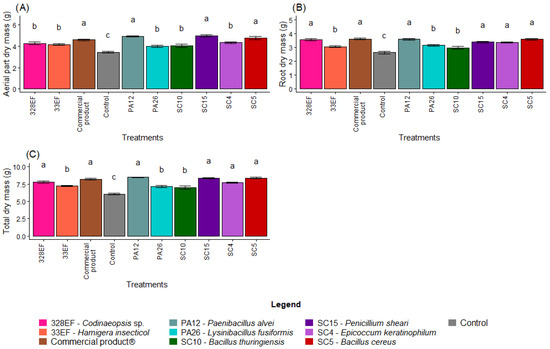 The promotion of plant growth by the isolates was evaluated by considering the biomass accumulation. For this, the plants were fragmented into leaves, stems and roots and the biomass was dried in an oven with forced air circulation at 65 °C until constant mass. Then, the dry mass of each plant part was determined. Total dry mass (TDM) was calculated based on the sum of the values corresponding to the biomass of each part of the plants (dry mass of aerial part − ADM + dry mass of root − RDM).