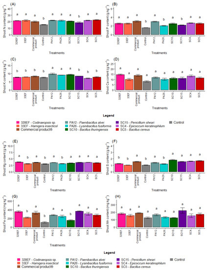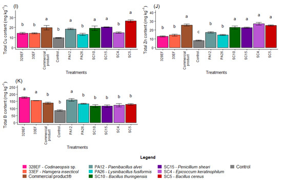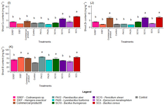The bacterium SC5 (B. cereus) and the fungus SC15 (P. sheari) stimulated the accumulation of Cu in the tissues of the aerial part, with mean values of 7.63 mg kg−1 and 6.16 mg kg−1, respectively (Figure 2I). The accumulation of Zn was also stimulated by these treatments and by the commercial product (Figure 2J). The B content was increased by treatment with PA12 (P. alvei), SC5 (B. cereus), 33EF (H. insecticol), Biomaphos®, and SC10 (B. thuringiensis) (Figure 2K).