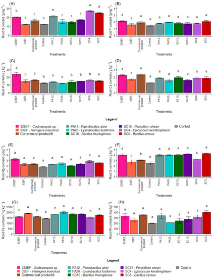 The N content in the roots was positively affected by inoculation with SC4 (E. keratinophilum), SC5 (B. cereus), and 328EF (Codinaeopsis sp.) (Figure 3A). However, P, Ca, Mg, Mn, and B contents were not differentially affected by the biopriming treatments (Figure 3B,D,E,H,K)). Furthermore, the fungus 328EF (Codinaeopsis sp.) stimulated the uptake of K by the roots of G. max plants (Figure 3C). This fungus, as well as the strains SC5 (B. cereus), SC15 (P. sheari), SC10 (B. thuringiensis), PA26 (L. fusiformis), and PA12 (P. alvei) increased the content of S in root tissues (Figure 3F). However, the control plants and those inoculated with the fungi 328EF (Codinaeopsis sp.) and SC4 (E. keratinophilum) and with Biomaphos® exhibited the lowest contents of Fe (Figure 3G).