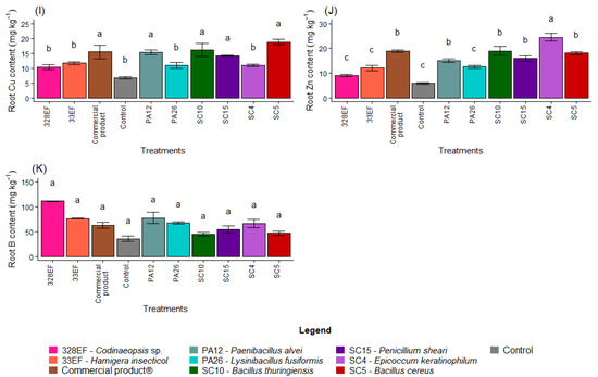 Total Cu content in the roots was also affected by the inoculation treatments, with the highest means obtained in plants inoculated with SC5 (B. cereus), SC15 (P. sheari), Biomaphos®, SC10 (B. thuringiensis), and PA12 (P. alvei) (Figure 4I). Zn content was also affected by SC5 (B. cereus), SC15 (P. sheari), Biomaphos®, and SC10 (B. thuringiensis) and by the fungus SC4 (E. keratinophilum) (27.20 mg kg−1) (Figure 4J). B content was positively affected by the PA12 bacterium (P. alvei) and by the fungi 328EF (Codinaeopsis sp.) and 33EF (H. insecticol), respectively (Figure 4K).