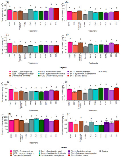 The mean content of Mg was higher in the plants inoculated with 328EF (Codinaeopsis sp.), SC4 (E. keratinophilum), SC5 (B. cereus), Biomaphos®, SC15 (P. sheari), and PA12 (P. alvei) (Figure 4E). Total S content was reduced in the control treatment and in the plants treated with the fungus 33EF (H. insecticol) (Figure 4F). Total Fe was also reduced in the plants of the control treatment as well as in those inoculated with SC4 (E. keratinophilum) (Figure 4G).