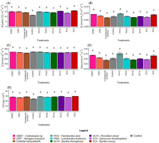 Photosynthetic rate, A (A); transpiration rate, E (B); internal concentration of CO2, Ci (C); stomatal conductance, Gsw (D); and chlorophyll index (E) in soybean plants (Glycine max) inoculated with fungal and bacterial strains isolated from Hymenaea courbaril and Butia purpurascens and cultivated in a controlled greenhouse system. Means followed by the same letter were not significantly different using the Scott–Knott test at 0.05% probability.