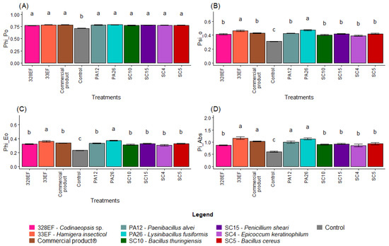 Overall, non-inoculated plants showed lower photochemical performance, with a lower mean value of PHI_Po (0.71), than the inoculated plants (Figure 6A). PSI_O was also lower in non-inoculated plants (0.31), while the highest means were obtained in plants inoculated with PA26 (L. fusiformis) and 33EF (H. insecticol) (Figure 6B). A similar behavior was observed for PHI_Eo, with these same plants exhibiting the highest values (Figure 6C). Pi_Abs, however, was positively affected not only by PA26 (L. fusiformis) and 33EF (H. insecticol) but also by PA12 (P. alvei) (1.00) and the commercial product (1.03) (Figure 6D).