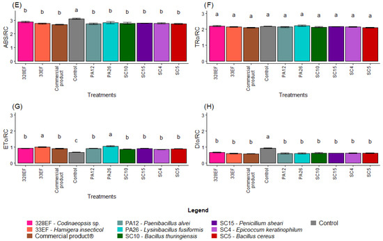 As expected, ABS. RC and DI0. RC, two indicators of photochemical stress, were higher in the control plants than in inoculated plants (Figure 6E,H). However, there was no difference in TR0. RC between the treatments (Figure 6F). PA26 (L. fusiformis) and 33EF (H. insecticol) had a positive effect on the ET0/RC means (Figure 6G).