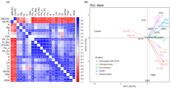 A negative and significant correlation was observed between ABS. RC and Dio. RC and the concentrations of most nutrients, A, chlorophyll index, ADM, and RDM. As expected, Phi_Po, Pi_Abs, ETo. RC, Psi_o, and Phi_Eo correlated positively and significantly with photosynthetic rate and the latter correlated positively with stomatal conductance. Moreover, the concentrations of N and P correlated positively with dry biomass (Figure 7A).