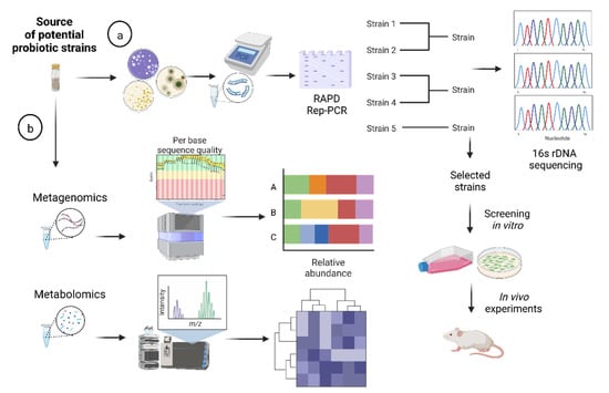 Representation of traditional and genomic-based approaches to identify potential probiotic candidates. (a) Classical isolation methods and further PCR genotyping (Rep-PCR, RAPD) allow strain identification, clustering, and selection of representative candidates for further in vitro and in vivo screening tests. (b) Metagenomics provides information on the relative abundance of microorganisms after massive sequencing of DNA (or cDNA), or RNA fragments from a sample and further bioinformatics analysis. Finally, metabolomics aims to identify, quantify, and characterize small-molecule metabolites produced by microorganisms from complex matrices. Two types of tools are required to analyze metabolomes: nuclear magnetic resonance and mass spectrometry. This figure was created with Biorender.com (accessed date: 9 June 2022).