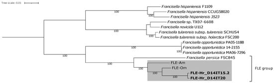 Phylogenetic inference of the MAGs of Francisella revealed that D14IT15.2 and D14IT20 belonged to Clade 1 of Francisella [], are separated from F. tularensis (FSC200, SCHUS4), and are members of a subclade within the FLE group (GTDB cluster: Francisella sp002095075) (Figure 2, shaded area). The FLE group consists of both cluster F. persica and Francisella sp002095075. Characterization of metagenome-assembled Midichloria and Rickettsia genomes revealed resemblance to M. mitochondrii and R. aeschlimannii, respectively, with the latter within the clade of Rickettsia rhipicephali, according to the taxonomy used by GTDB (Figures S1 and S2 in the Supplementary Materials).