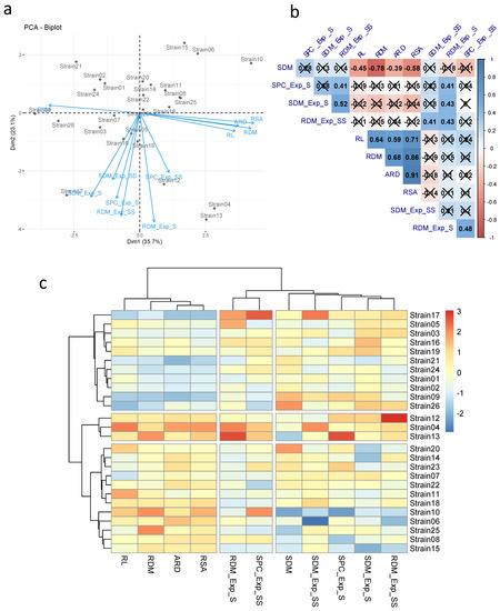 Multivariate analysis and correlation among traits evaluated in maize experiments (germination paper and greenhouse) with seeds inoculated with different phosphorus-solubilizing bacteria. (a) Principal component analysis; (b) Pearson correlation; and (c) UPGMA hierarchical grouping. (×: No significant effect). (ARD: average root diameter, RSA: root surface area, RL: root length, RDM: root dry mass, SDM: shoot dry mass, and SPC: shoot phosphorus content. Exp_S: greenhouse experiment—sand substrate, Exp_SS: greenhouse experiment—sand:soil substrate (3:1)).