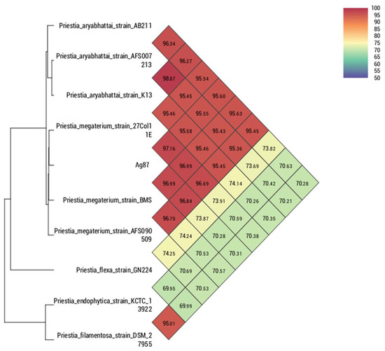 Heatmap generated with OAT software indicating the OrthoANI values of Bacillus megaterium strain Ag87 and the closely related Bacillus species.