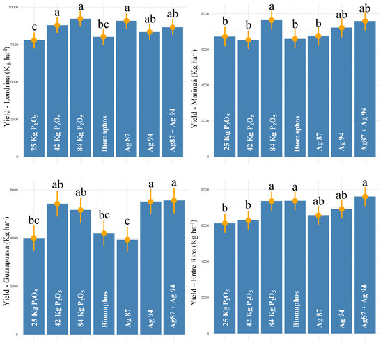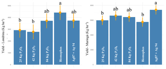 For the experiments installed in Paraná (Londrina and Maringá), a significant effect was observed for all sources of variation (treatments, environments, and treatments × environments) for grain yield (Table 2). The experimental coefficient of variation was 12.6, and all the assumptions of the analysis of variance were met. The average yield was 3516.6 kg ha−1 in Londrina and 6434.40 kg ha−1 in Maringá. Regarding the treatments, Biomaphos, 100% P, and Ag87 + Ag94 resulted in the highest yields (4419, 3722, and 3736 kg ha−1, respectively) in Londrina. By contrast, in Maringá, the highest yields were obtained by applying Ag87 + Ag94, 50% P, and 100% P (7398, 6611, and 6421 kg ha−1, respectively) (Figure 5).