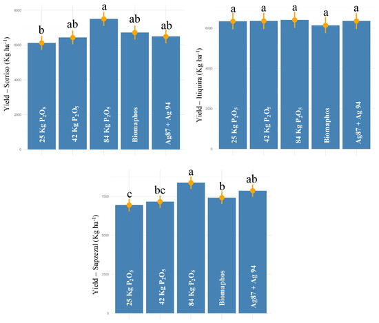 For the experiments conducted in Mato Grosso (Sorriso, Itiquira, and Sapezal), a significant effect was also observed for all sources of variation for grain yield (Table 2). The average productivity obtained by the environments was 6653.19, 6321.4, and 7553.43 kg ha−1, respectively (Figure 6). For Sorriso, the highest yield was obtained for 100% P (7500 kg ha−1), not differing statistically from Biomaphos, Ag87 + Ag94, and 50% P (6716.1, 6494.6, and 6432.2 kg ha−1, respectively). Biomaphos and Ag87 + Ag94 led to productivity increases of 9 and 6% in relation to the 30% P control, respectively. In Itiquira, no differences were observed between treatments, while for Sapezal, the highest productivity values were observed for the 100% P and Ag87 + Ag94 treatments (8377.5 and 7869.6 kg ha−1, respectively). The application of Ag87 + Ag94 resulted in an average yield increase of 13% in relation to the 30% P control.