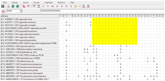 For the design of a specific Legionella spp. probe, an approach using available alignment programs coupled with the 16S rRNA databases was used according to the methodology described by Teixeira et al. (2021) [34]. From these, a group of 9 target Legionella and 27 non-target sequences were selected from the ARB Silva database (https://www.arb-silva.de/; accessed on May 2020). Only sequences with a length above 1200 bp, high sequence quality (>90%), high alignment quality (>90%) and high pintail quality (>90%) were selected. Regions of interest were identified with MEGA-X and aligned with ClustalW (https://www.megasoftware.net/; last accession on June 2020) (Figure 1). High GC percentage and low number of consecutive self-complementary nucleotides were also criteria to consider in sequence selection.