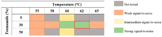 Temperature and formamide concentration assessments for hybridization conditions optimization. The selected conditions for the best performance are 62 °C and 30% formamide (red bracket).