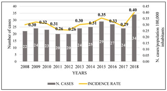 Distribution of the number of new cases of cryptococcosis per year and the incidence rate by state population per 100,000 inhabitants, 2008–2018, JBBUH, Pará, Brazil.