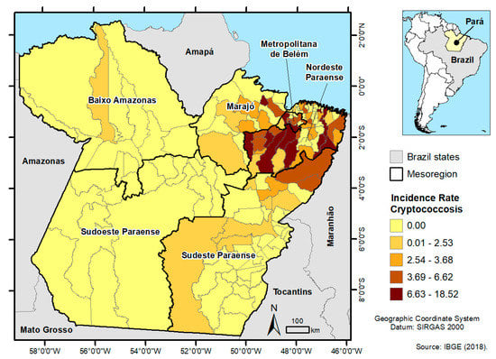 Spatial distribution of the incidence rate of cryptococcosis according to the population of the mesoregions of the Pará per 100,000/inhabitants. (IBGE). 2008–2018, JBBUH, Pará, Brazil.