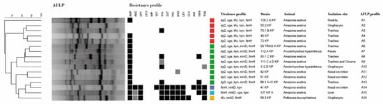 Sixteen Klebsiella spp. strains were isolated from 46 infected birds, and all colonies were identified as K. pneumoniae by MALDI-TOF MS. All strains carried three to five virulence genes, being positive for fimH (100%), kpn (93.75%), uge (87.50%), irp-2 (81.25%), mrkD (68.75%), and kfu (37.50%). Results identified five different virulence profiles, with predominance of irp2+uge+kpn+mrkD+fimH (8/16) and irp2+uge+kpn+kfu+fimH (5/16) genotypic traits. The SE-AFLP classified these strains into 15 distinct patterns, with a discriminatory index of 0.96. Studied strains were from noncontacting birds, located in various places, and were heterogeneous (Figure 1).