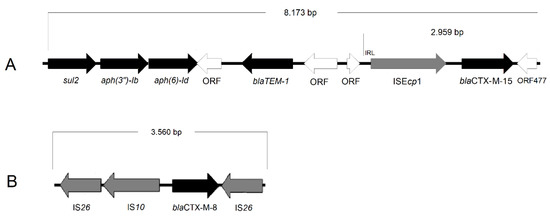 Genetic environment of blaCTX-M-15 (A) and blaCTX-M-8 (B) in ESBL-producing isolates. Black arrows indicate resistance genes, gray arrows indicate genes related to mobile elements, and white arrows indicate open read frames (ORFs) (bp = base pairs).