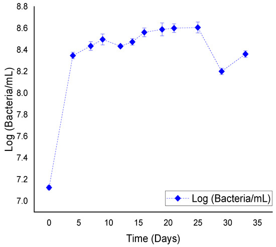 Figure 1. The exponential phase takes place from day 1 to day 4. The stationary phase began on day 5 and lasted 20 days. There was a decrease point after day 30 and a small recovery on day 35.