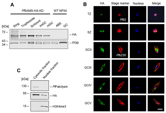 To determine the subcellular localization, protein extraction was carried out using a series of lysis and extraction buffers. In brief, ~3 × 106 schizonts of the PfSAMS-HA-KD line were purified via Percoll gradient and liberated from the RBCs with 0.03% w/v saponin/PBS for 3 min at 4 °C. After washing with PBS, parasites were hypotonically lysed in 100–200 µL of the lysis buffer containing 20 mM HEPES, 10 mM KCl, 1 mM EDTA, 1 mM dithiothreitol (DTT), 1 mM PMSF, 1% Triton X-100 (pH 7.8), supplemented with protease inhibitor cocktail (complete EDTA-free, Roche) for 10 min on ice. Following centrifugation at 2500× g for 5 min at 4 °C, the cytosolic proteins were harvested with the supernatant and stored at −80 °C. After several steps of washing the remaining pellet with the lysis buffer, nuclear proteins were extracted with about 2 volumes of the extraction buffer containing 20 mM HEPES, 800 mM KCl, 1 mM EDTA, 1 mM DTT, and 1 mM PMSF (pH 7.8), supplemented with protease inhibitor cocktail. Supernatants were centrifuged to remove residual material. The individual fractions were subjected to Western blotting as described below.