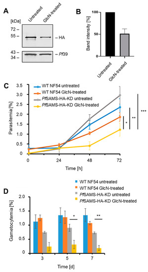 To induce the conditional knockdown of PfSAMS-HA synthesis, asexual blood-stage parasites were treated with 5 mM GlcN for 72 h. Upon GlcN addition, PfSAMS-HA levels were significantly reduced to 50.1 ± 7.27% compared to the untreated control, as shown by quantitative Western blotting (Figure 2A,B).