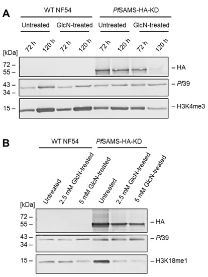 Because PfSAMS has been assigned a major role in histone methylation during transcriptional regulation, we investigated the effect of PfSAMS deficiency on two histone H3 methylation marks, for which efficient antibodies are available, i.e., H3K4me3 and H3K18me1. Asexual blood-stage parasite cultures were treated with GlcN for 72 or 120 h at concentrations of 2.5 mM or 5 mM. Lysates were immunoblotted with anti-HA antibodies to detect PfSAMS-HA in the samples, while the H3K4me3 and H3K18me1 methylation marks were detected with the respective antibodies (Figure 3A,B). Treatment of the PfSAMS-HA-KD line with GlcN affected the PfSAMS-HA levels, as expected, and further reduced the methylation status for the two methylation marks. The levels of Pf39, used as a loading and viability control, were not affected by the GlcN treatment. Further, no down-regulation in the histone methylation marks due to GlcN-treatment was observed in WT NF54 parasites.