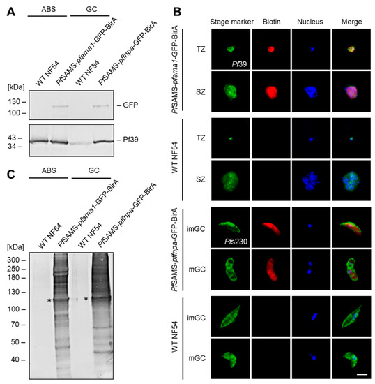 Subsequent immunolabeling experiments using fluorophore-conjugated streptavidin unveiled the presence of biotinylated proteins in the cytoplasm and nuclear regions of asexual blood-stage parasites and gametocytes of the respective transfectant lines, when these were incubated with 50 μM biotin for 24 h prior to fixation (Figure 4B); the WT NF54 control was also incubated with 50 μM biotin for 24 h prior to fixation and no biotinylated proteins were detected. Noteworthy, the signals for immunolabeled PfSAMS-GFP-BirA and immunolabeled biotinylated proteins overlapped (Figure S5B), confirming that proteins in the proximity of PfSAMS-GFP-BirA were biotinylated. When lysates of the biotin-treated cultures were subjected to Western blot analysis, using streptavidin conjugated to alkaline phosphatase, multiple protein bands indicative of biotinylated proteins were detected, including a protein band at ~108 kDa, representing biotinylated PfSAMS-GFP-BirA (Figure 4C). No biotin–positive protein bands were detected in WT NF54 samples.
