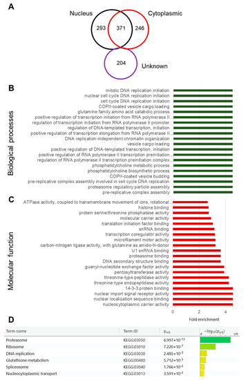 Functional prediction analysis of putative interaction partners of PfSAMS. A total of 1114 identified potential interactors of PfSAMS were matched to the PlasmoDB database entries for their cellular localization, biological processes, and molecular function based on GO term enrichment analyses of both computed and curated data at a p-value of 0.01. (A) Venn diagram showing the predicted nuclear and cytoplasmic localization of the identified interactors, including proteins of unknown localization. The GO categories “Nucleus” (GO:0005634) and “Cytoplasm” (GO:0005737) were considered. (B,C) Interactors of the 20 highest scoring biological processes (B) and 20 highest scoring molecular functions (C) as predicted by GO enrichment analysis, sorted by fold enrichment. (D) KEGG analysis of PfSAMS interactors.