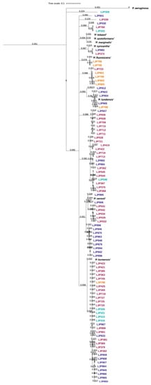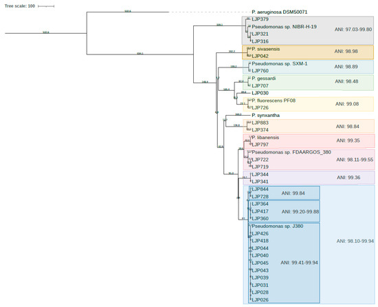 The pairwise calculated ANI values (Figure S2) support the clusters in the phylogenetic tree. By using the ANI value cutoff at ≥99.00% for strains and ≥96.50% for species [45,46], these pairwise ANI calculations between the isolates and ten reference genomes revealed 11 different species among our isolates as indicated by the colored boxes in Figure 3.