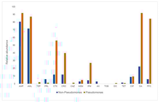 Relative abundance of Pseudomonas and non-Pseudomonas isolates sampled from different sampling points in a salmon processing facility harboring phenotypical resistance towards sixteen different antibiotics. AMP-ampicillin, AML-amoxicillin, TZP-piperacillin/tazobactam, PRL-piperacillin, CTX-cefotaxime, CRO-ceftriaxone, CAZ-ceftazidime, MEM-meropenem, IPM-imipenem, AK-amikacin, TOB-tobramycin, DO-doxycycline, TET-tetracycline, CIP-ciprofloxacin, OA-oxacilinic acid, FFC-florfenicol.