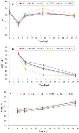 Figure 2 shows the pH, VOA, and TAN values in biogas reactors. Throughout the process, the mean pH values in the anaerobic digesters initially decreased from ~7.7 to 7.2–7.4 (on day 3), but finally achieved the values of ~7.5, as shown in Figure 2a. The lowest pH values were observed in C1 on day 3. In addition, temporal changes in volatile organic acids (VOA) concentrations were observed (Figure 2b). It has been observed that VOA consumption by microorganisms is clearly dependent on the addition of various supplements. The addition of magnetite, GAC, and biochar reduced the cumulative VOA concentrations during the anaerobic digestion period, with the GAC/magnetite being more active compounds. Thus, the mean acid capacity in the anaerobic digesters with additives was in the range of 2.4–2.6 g L−1, whereas in control experiments it was 2.8 g L−1 (on day 3). This indicates that the CH4-forming activity in the control batch tests was lower at the beginning of the treatments. Finally, most of the organic acids in all batch tests were efficiently converted to biomethane. It should be additionally noted that some organic acids were derived from the inoculum.
