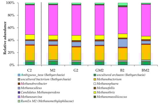 The dominant archaeal classes observed in our experiments were Methanomicrobia and Methanobacteria. This is consistent with the data of other works reporting the predominance of these groups of methanogens during anaerobic digestion of chicken manure [21,37,38]. Other observed phyla were Thermoplasmata within Euryarchaeota (ranging from 2 to 7%) and Bathyarchaeia within Crenarchaeota (in the range of 7–9%). Recent findings indicate that the phylogenetic diversity of methanogens may be much higher, with the inclusion of archaeal phyla outside the Euryarchaeota such as Bathyarchaeia [39,40], which allows us to note that the archaeal communities in our reactors included a wide variety of methanogens. The archaeal community structure analysis showed that the most dominant order was Methanosarcinales (ranging from 50 to 57%) followed by Methanobacteriales (in the range of 21–26%) in all reactors. The archaeal community structure on the genus level is shown in Figure 7.