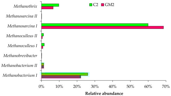 In the case of the control reactor and the reactor GM2, methanogenic consortia were additionally investigated by the mcrA gene amplicon high-throughput sequencing approach (Figure 8). Thus, more than 60 thousand high-quality mcrA gene sequences were obtained for both samples. The mcrA gene approach allowed a higher level of Methanosarcina and a lower level of Methanothrix and Methanobacterium in the reactor with the addition of GAC and magnetite to be detected. The relative abundance data received by using the mcrA gene give better results, since data obtained with the use of the 16S rRNA gene approach are more biased because of the different copy numbers of rRNA operons in different archaeal taxa, while mcrA is a single-copy gene in most methanogenic archaea.