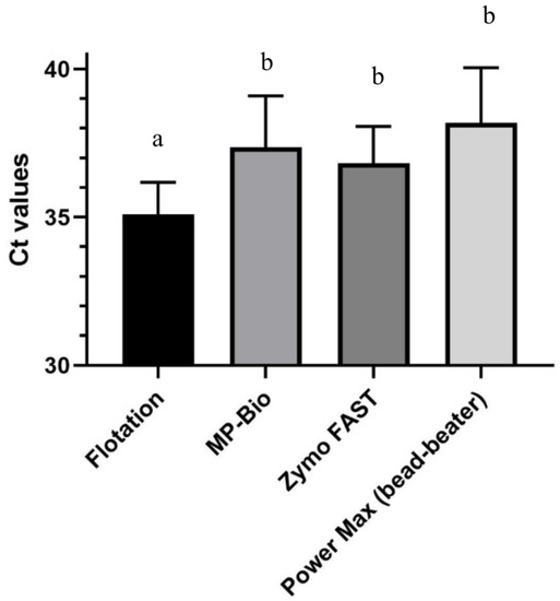 Statistically significant differences were observed in the average CT values for C. cayetanensis 18S rRNA in samples seeded with 100 C. cayetanensis oocysts by qPCR among methods, with the flotation method showing statistically lower CT values for C. cayetanensis 18S rRNA (better detection) than each of the other direct DNA isolation methods (p < 0.05). No statistically significant differences were observed between the Fast DNATM 50 mL SPIN kit for soil (MP Biomedicals), the Quick-DNATM Fecal/Soil Microbe Midiprep kit (Zymo Research) and DNeasy® PowerMax® Soil Kit (Qiagen)) using the modified protocol including bead-beating (p > 0.05) (Table 2, Figure 1).
