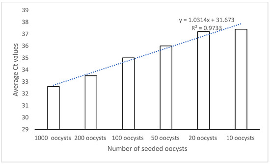 The standard curve of the whole range of 10 g soil samples seeded with known numbers of oocysts (from 1000 oocysts to 10 oocysts) was linear and showed an excellent R-square value (R2: 0.9733) (Figure 2).