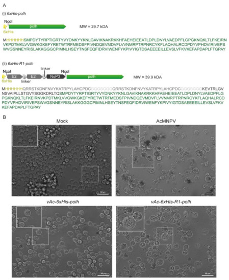 Schematic representation and light microscope of recombinants 6xHis-polh and 6xHis-R1-polh. (A) Schematic representation of modified polh gene cloned into pFastBac1 to generate 6xHis-polh and CHIKV multi-epitope gene (R1) fused at 5′ region of polh (6xHis-R1-polh); (B) Sf9 cells at 72 h.p.i. with the respective second passage virus stock (m.o.i. of five): mock-infected cells, cells infected with vAc-6xHis-polh, vAc-polh-R1-6xHis, and AcMNPV. The insets show details of infected cells with the amorphous crystal that accumulate in nucleus of the infected cells.