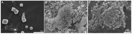 Scanning electron microscopy (SEM) of the purified recombinant OBs. (A) Native AcMNPV OB; (B) 6xHis-polh OBs; and (C) 6xHis-R1-polh OBs (Scale bar = 1 or 10 µm).