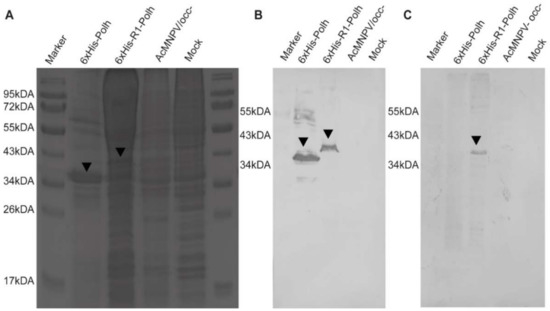 Protein expression analyses of the recombinant 6xHis-R1-polh in insect cells infected with different recombinant baculoviruses, including vAc-6xHis-polh, vAc-6xHis-R1-polh, and AcMNPV/occ- (without polh expression). (A) SDS-PAGE of insect cells extracts infected with different recombinant baculoviruses; (B,C) Membranes immune-stained with (B) anti-6xHis (Promega), (C) anti-CHIKV-positive patient’s serum as primary antibodies, incubated with mouse and human anti-IgG, respectively, and conjugated to alkaline phosphatase enzyme (Invitrogen). The proteins’ reacting bands were detected using the substrate NBT/BCIP (Promega). Black arrowheads point the specified bands.