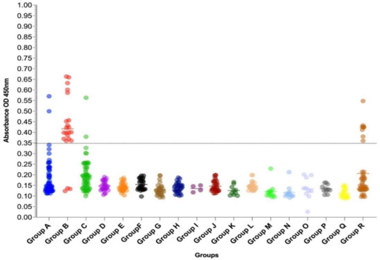 Based on the analysis of the sera from healthy individuals (Group Q), considered true negative, the specificity for the Anti-Chikungunya virus IgM ELISA kit was 100% (Table 1). However, on the sera of the symptomatic suspected cases for arboviral infection (dengue), considered as negative after differential diagnosis (Group R), the test was positive in 18.60% (8/43) of the cases, but most of those were close to the MULTREC IgG-ELISA cut-off value (Figure 4). No cross-reactivity was observed with sera from the dengue IgG positive patients (Group I), positive for Zika (Group J), yellow fever (Group K) or those vaccinated against yellow fever (Group L), positive for rubella (Group M), measles (Group N), hepatitis C (Group O) and leptospirosis (Group P) (Table 1 and Figure 4).